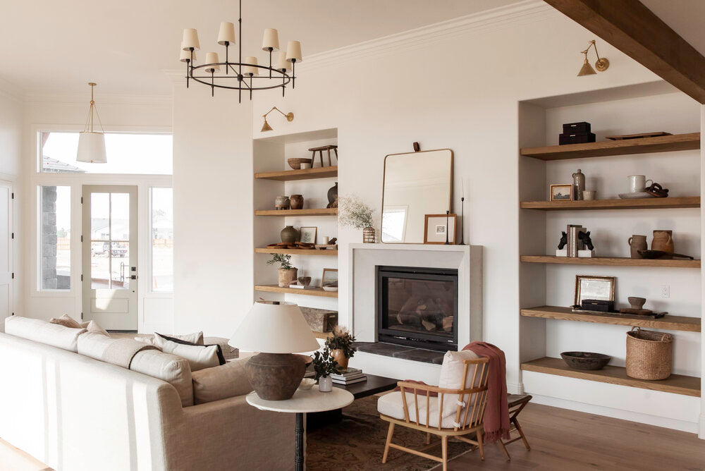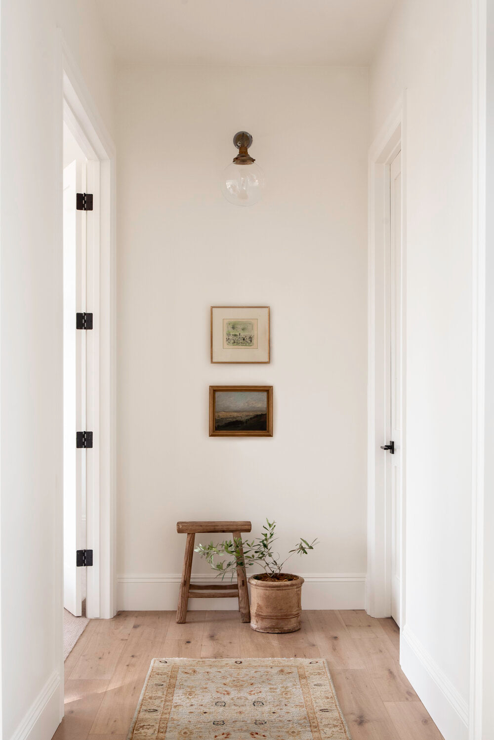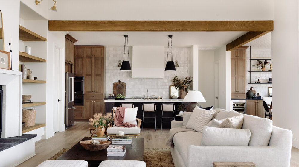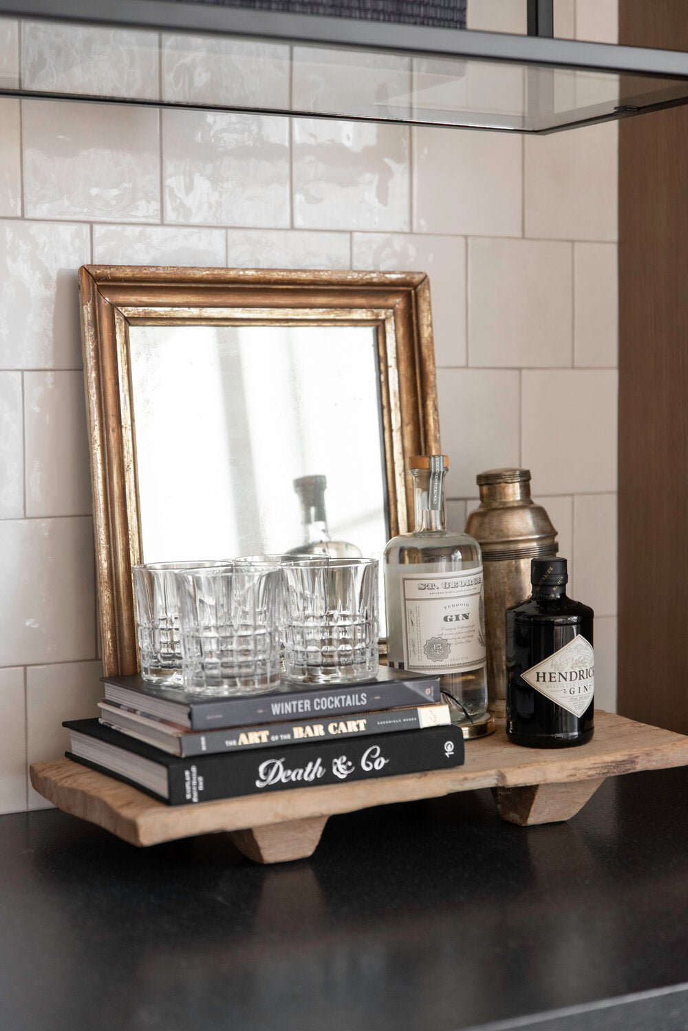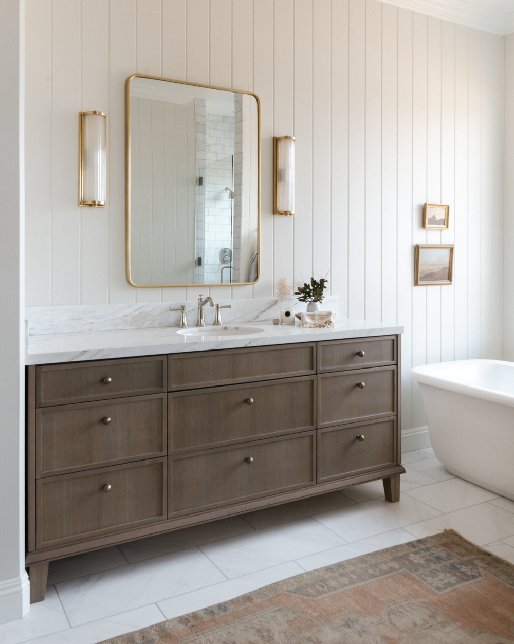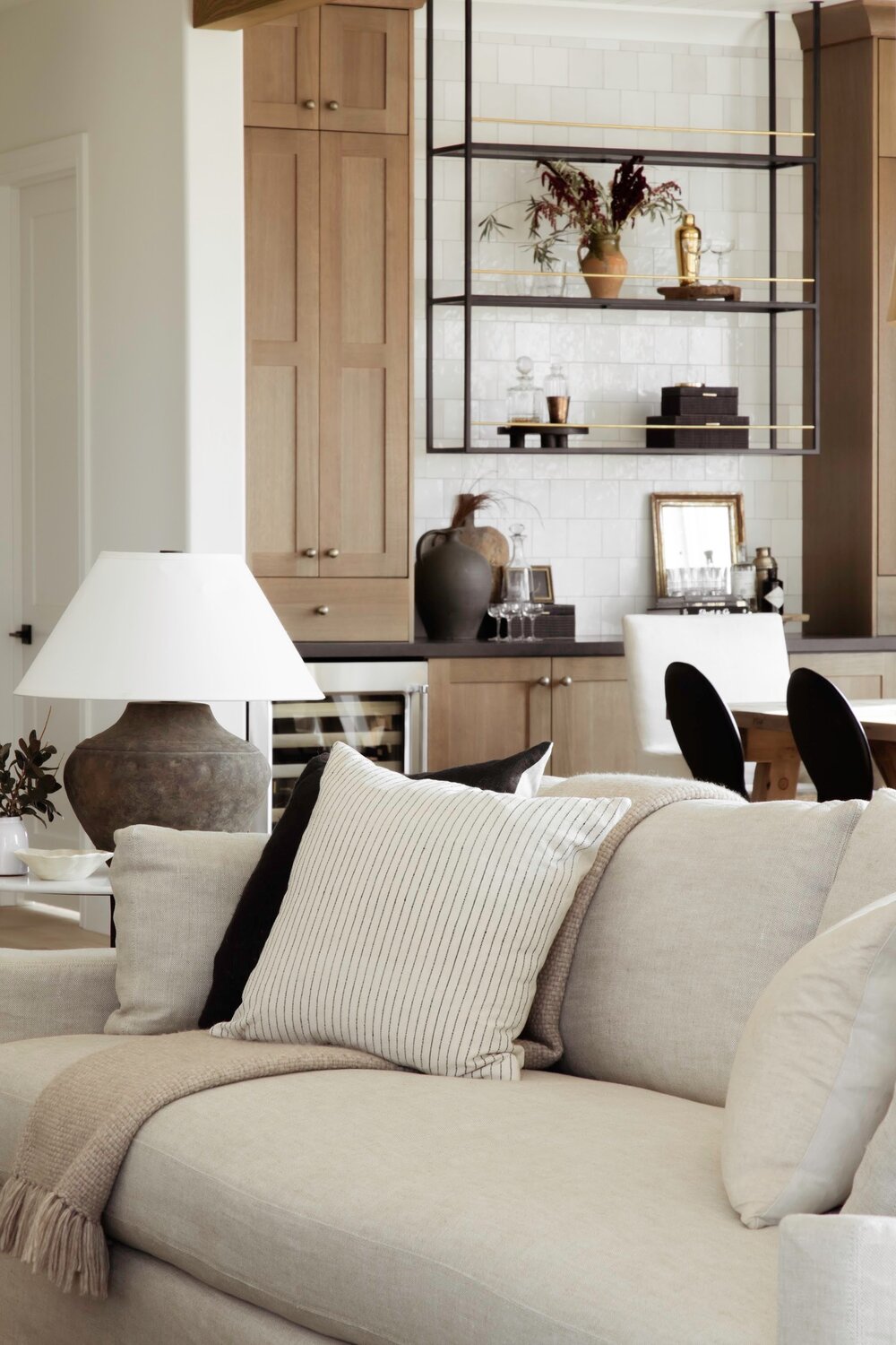 In this spec home, we designed a kitchen that feels modern yet timeless. The custom white oak stain blend is a standout feature, complemented by Swiss Coffee walls and marble countertops. A custom bar system and Rohl plumbing fixtures complete the refined look, creating a space that’s both functional and sophisticated.