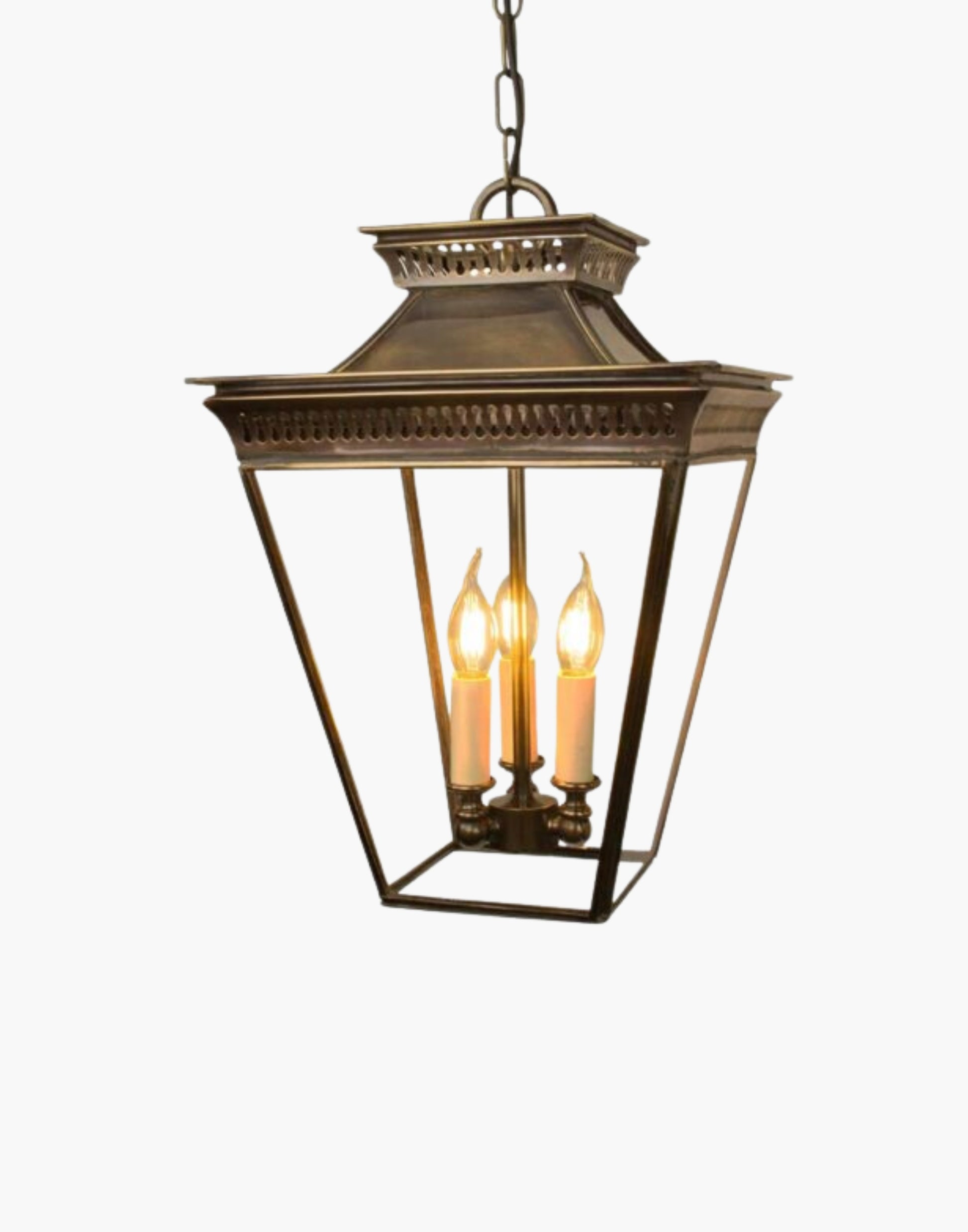 The Pagoda Pendant (Medium) is crafted from solid brass, drawing inspiration from traditional Oriental Pagoda-roofed buildings that heavily influenced Georgian Colonial architecture. Featuring two-tiered pierced fretwork and a Far Eastern Colonial-style Pagoda roof, this elegant hanging lantern brings timeless charm to any space.