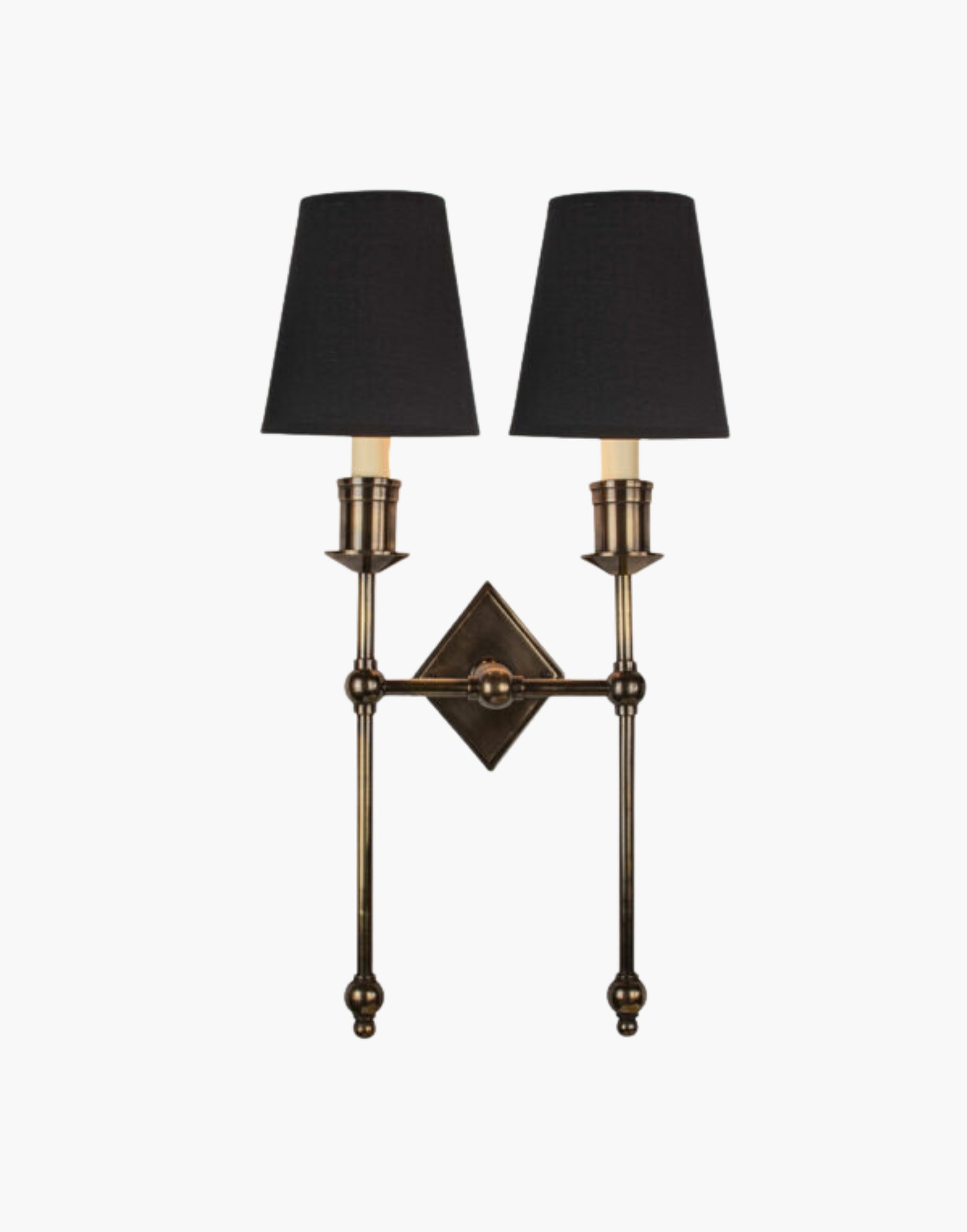 Crafted from solid cast and machined brass, the Christina Twin Tall Wall Sconce boasts a striking diamond-shaped backplate with a scalloped edge and bold sconce detail, adding a distinctive touch to any space. With its versatile design, it complements both contemporary and traditional interior schemes. Customize with optional D6 and D6G shades.